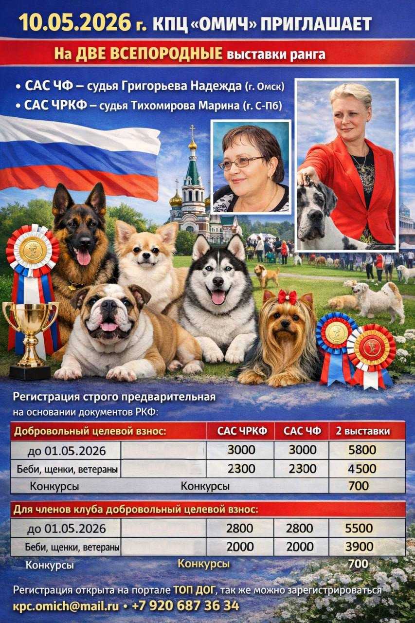 | 10.05.2026 | Национальная выставка собак всех пород ранга САС - ЧРКФ | CAC Чемпион РКФ | Тихомирова Марина | Краткий каталог | Подать заявку |