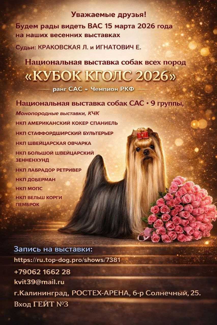 Целевой выставочный взнос для участия в монопородных выставках по запросу куратору высавок на почту kvit39@mail.ru