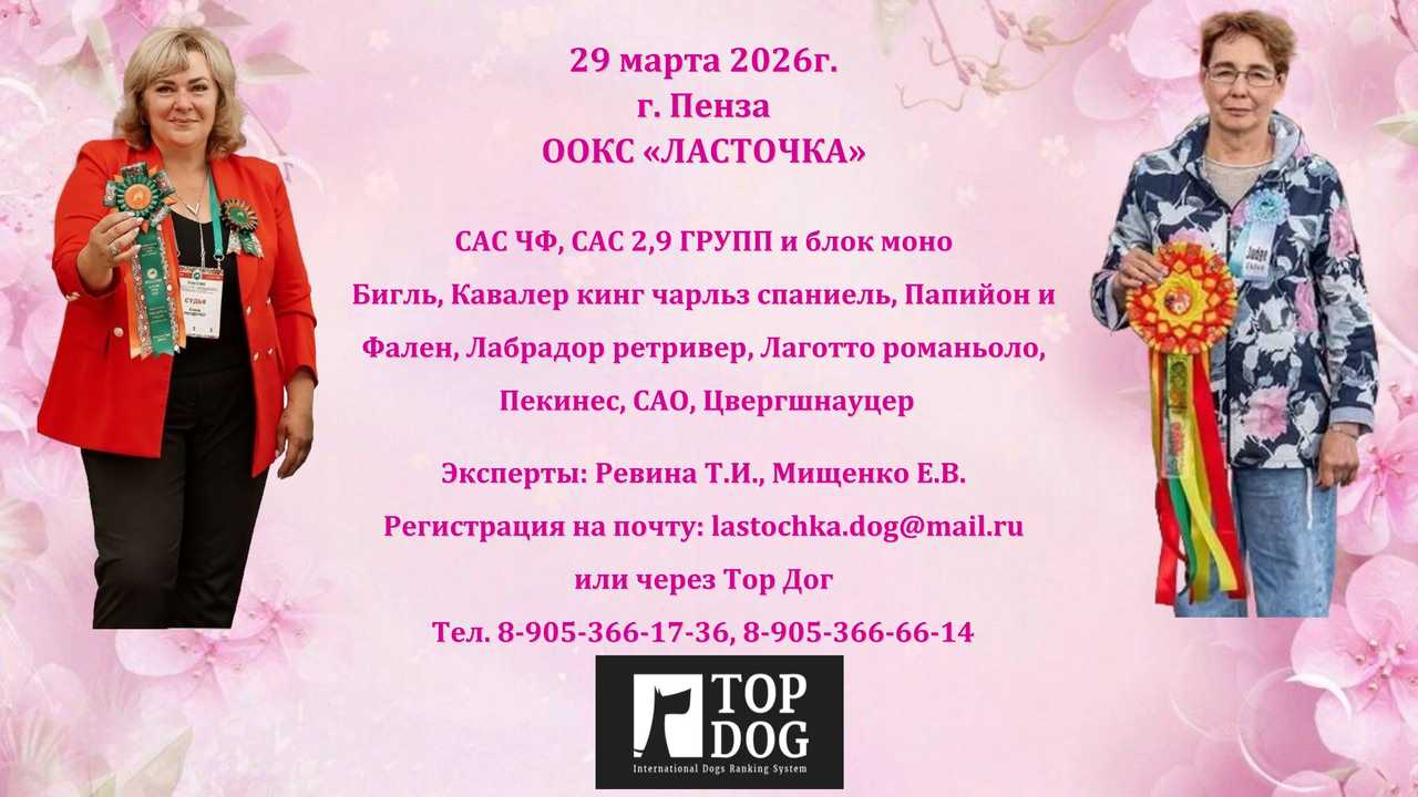 | 29.03.2026 | САС 9 группы пород | CAC Групп | Мищенко Елена Ревина Татьяна | Подать заявку | ||