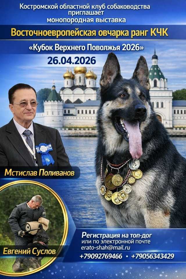 | 26.04.2026 | Монопоросная выставка КЧК восточноевропейских овчарок | Кандидат в чемпионы национального клуба породы | Поливанов Мстислав | Расписание | Краткий каталог | Подать заявку |