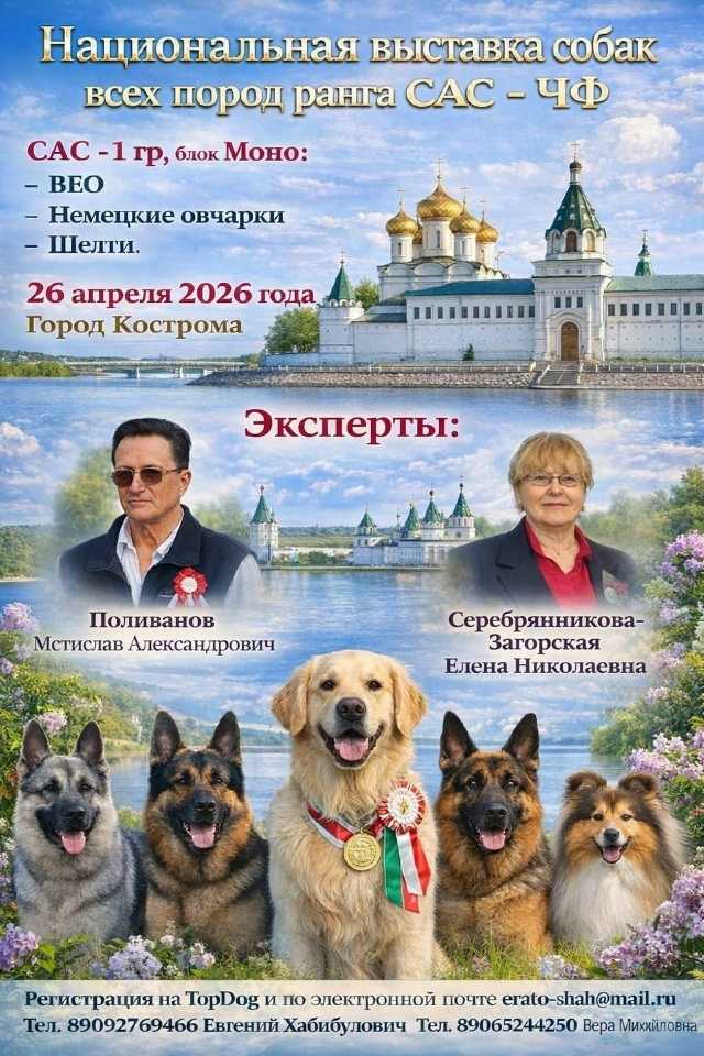 | 26.04.2026 | Национальная выставка собак всех пород ранга САС - ЧФ | CAC Чемпион Федерации | Серебрянникова-Загорская Елена | Расписание | Краткий каталог | Подать заявку |