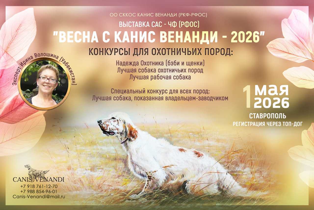| 01.05.2026 | Национальная выставка собак всех пород ранга САС - ЧФ | CAC Чемпион Федерации | Волошина Ирина | Расписание | Краткий каталог | Подать заявку |